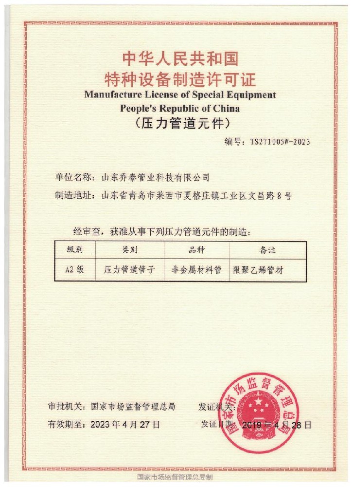 2019年4月28日,山東喬泰管業(yè)科技有限公司獲得了國(guó)家市場(chǎng)監(jiān)督管理總局頒發(fā)的A2級(jí)壓力管道元件,特種設(shè)備制造許可證(證書(shū)編號(hào):TS271005W-2023)。獲此證書(shū),喬泰管業(yè)在PE管材領(lǐng)域又上了…